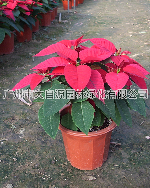 一品红是短日照植物,喜温暖,长适温为18-25℃,4-9月为18-24℃,9月至翌年4月为13-16℃,冬季温度不低于10℃;喜湿润,一品红对水分的反应比较敏感,生长期只要水分供应充足;喜阳光,在茎叶生长期需充足阳光,促使茎叶生长迅速繁茂。一品红不耐干旱,又不耐水湿,浇水要根据天气、盆土和植株生长情况灵活掌握,一般浇水以保持盆土湿润又不积水为度,但在开花后要减少浇水。浇水要注意调匀,防止过干过湿,否则会造成植株下部叶子发黄脱落,俗称“脱脚”,或枝条生长不均匀。一品红花色鲜艳,花期长,正值圣诞、元旦、春节开花,盆栽布置室内环境可增加喜庆气氛;也适宜布置会议等公共场所。南方暖地可露地栽培,美化庭园,也可作切花。